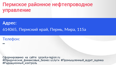 Пермское районное нефтепроводное управление по адресу 614065, Пермский край, Пермь, Мира, 115а в дальнейшем Организация, размещена в следующих категориях: