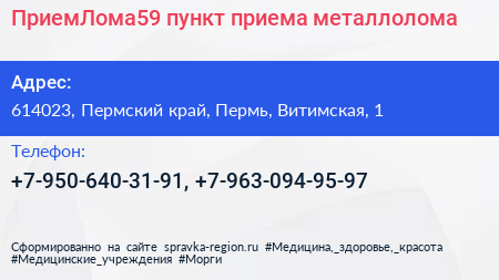 ПриемЛома59, пункт приема металлолома по адресу 614023, Пермский край, Пермь, Витимская, 1 в дальнейшем Организация, размещена в следующих категориях: