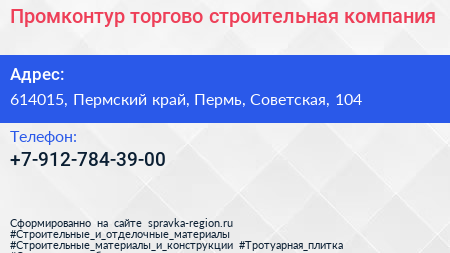 Промконтур, торгово-строительная компания по адресу 614015, Пермский край, Пермь, Советская, 104 в дальнейшем Организация, размещена в следующих категориях: