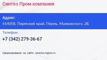 Синтез-Пром, компания по адресу 614058, Пермский край, Пермь, Маяковского, 2Б в дальнейшем Организация, размещена в следующих категориях: