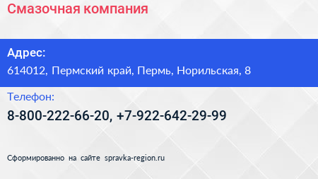 Смазочная компания по адресу 614012, Пермский край, Пермь, Норильская, 8 в дальнейшем Организация, размещена в следующих категориях: