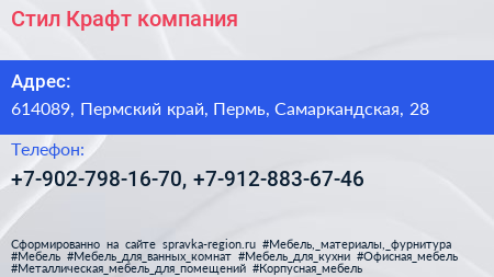 Стил Крафт, компания по адресу 614089, Пермский край, Пермь, Самаркандская, 28 в дальнейшем Организация, размещена в следующих категориях: