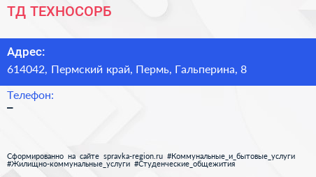 ТД ТЕХНОСОРБ по адресу 614042, Пермский край, Пермь, Гальперина, 8 в дальнейшем Организация, размещена в следующих категориях: