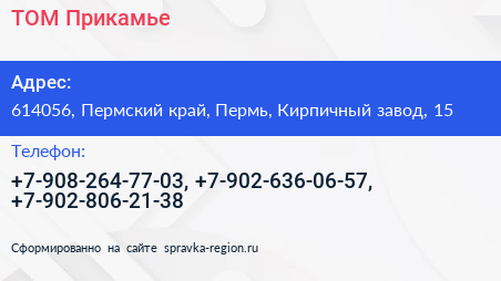 ТОМ-Прикамье по адресу 614056, Пермский край, Пермь, Кирпичный завод, 15 в дальнейшем Организация, размещена в следующих категориях: