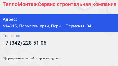 ТеплоМонтажСервис, строительная компания по адресу 614015, Пермский край, Пермь, Пермская, 34 в дальнейшем Организация, размещена в следующих категориях: