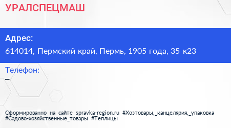 УРАЛСПЕЦМАШ по адресу 614014, Пермский край, Пермь, 1905 года, 35 к23 в дальнейшем Организация, размещена в следующих категориях: