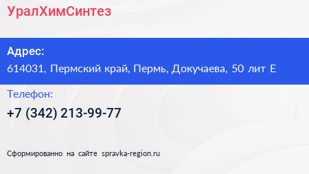 УралХимСинтез по адресу 614031, Пермский край, Пермь, Докучаева, 50 лит Е в дальнейшем Организация, размещена в следующих категориях: