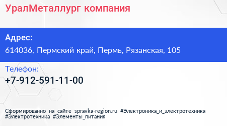 УралМеталлург, компания по адресу 614036, Пермский край, Пермь, Рязанская, 105 в дальнейшем Организация, размещена в следующих категориях: