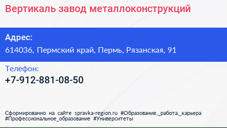 Вертикаль, завод металлоконструкций по адресу 614036, Пермский край, Пермь, Рязанская, 91 в дальнейшем Организация, размещена в следующих категориях: