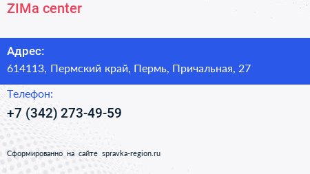 ZIMa-center по адресу 614113, Пермский край, Пермь, Причальная, 27 в дальнейшем Организация, размещена в следующих категориях: