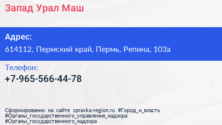 Запад Урал Маш по адресу 614112, Пермский край, Пермь, Репина, 103а в дальнейшем Организация, размещена в следующих категориях: