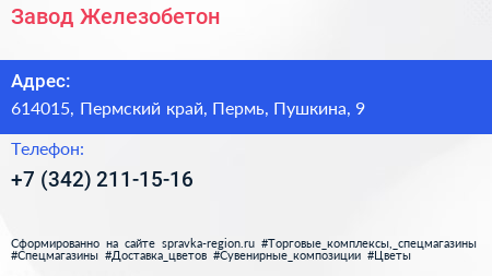 Завод Железобетон по адресу 614015, Пермский край, Пермь, Пушкина, 9 в дальнейшем Организация, размещена в следующих категориях: