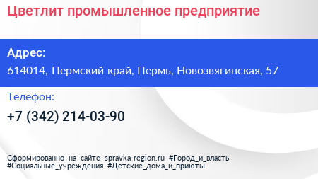 Цветлит, промышленное предприятие по адресу 614014, Пермский край, Пермь, Новозвягинская, 57 в дальнейшем Организация, размещена в следующих категориях: