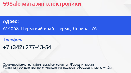 59Sale, магазин электроники по адресу 614068, Пермский край, Пермь, Ленина, 76 в дальнейшем Организация, размещена в следующих категориях: