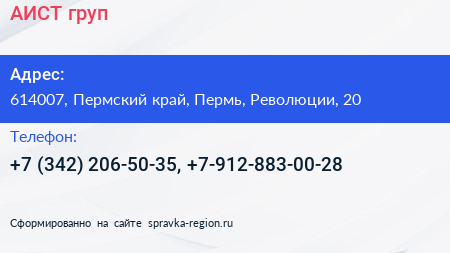 АИСТ груп по адресу 614007, Пермский край, Пермь, Революции, 20 в дальнейшем Организация, размещена в следующих категориях: