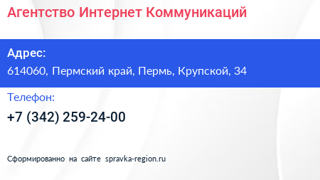 Агентство Интернет Коммуникаций по адресу 614060, Пермский край, Пермь, Крупской, 34 в дальнейшем Организация, размещена в следующих категориях: