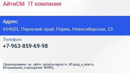АйтиСМ+, IT-компания по адресу 614021, Пермский край, Пермь, Новосибирская, 13 в дальнейшем Организация, размещена в следующих категориях: