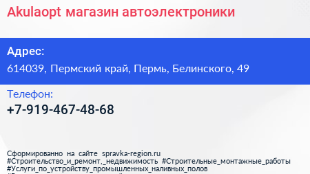 Akulaopt, магазин автоэлектроники по адресу 614039, Пермский край, Пермь, Белинского, 49 в дальнейшем Организация, размещена в следующих категориях: