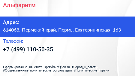 Альфаритм по адресу 614068, Пермский край, Пермь, Екатерининская, 163 в дальнейшем Организация, размещена в следующих категориях: