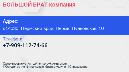 БОЛЬШОЙ БРАТ, компания по адресу 614030, Пермский край, Пермь, Пулковская, 10 в дальнейшем Организация, размещена в следующих категориях: