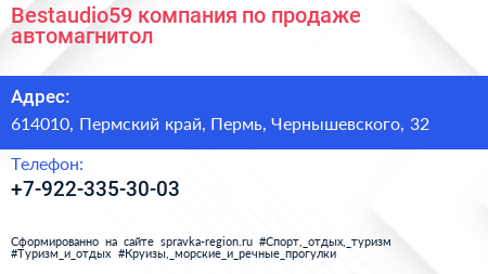 Bestaudio59, компания по продаже автомагнитол по адресу 614010, Пермский край, Пермь, Чернышевского, 32 в дальнейшем Организация, размещена в следующих категориях: