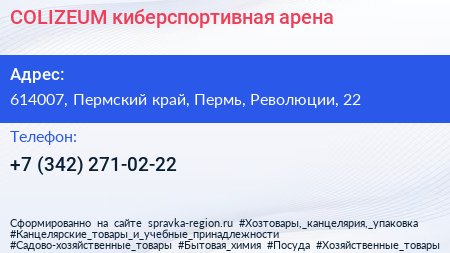 COLIZEUM, киберспортивная арена по адресу 614007, Пермский край, Пермь, Революции, 22 в дальнейшем Организация, размещена в следующих категориях: