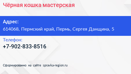 Чёрная кошка, мастерская по адресу 614068, Пермский край, Пермь, Сергея Данщина, 5 в дальнейшем Организация, размещена в следующих категориях: