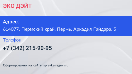 ЭКО-ДЭЙТ по адресу 614077, Пермский край, Пермь, Аркадия Гайдара, 5 в дальнейшем Организация, размещена в следующих категориях: