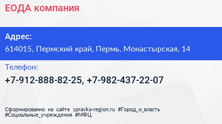 ЕОДА, компания по адресу 614015, Пермский край, Пермь, Монастырская, 14 в дальнейшем Организация, размещена в следующих категориях: