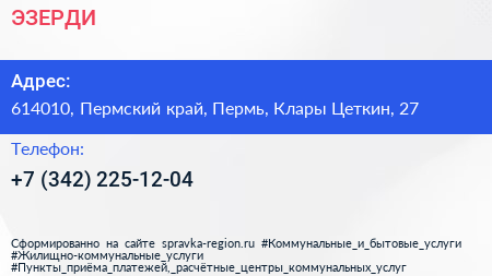 ЭЗЕРДИ по адресу 614010, Пермский край, Пермь, Клары Цеткин, 27 в дальнейшем Организация, размещена в следующих категориях: