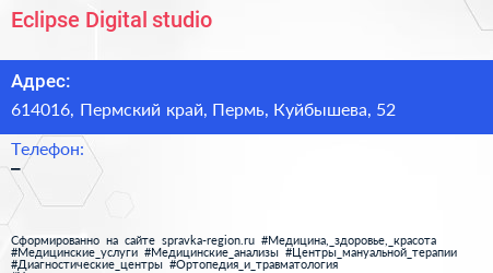 Eclipse Digital studio по адресу 614016, Пермский край, Пермь, Куйбышева, 52 в дальнейшем Организация, размещена в следующих категориях:
