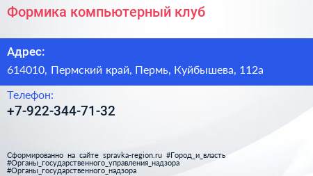 Формика, компьютерный клуб по адресу 614010, Пермский край, Пермь, Куйбышева, 112а в дальнейшем Организация, размещена в следующих категориях: