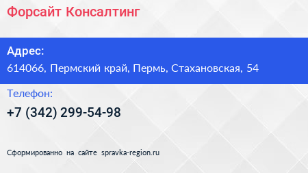 Форсайт Консалтинг по адресу 614066, Пермский край, Пермь, Стахановская, 54 в дальнейшем Организация, размещена в следующих категориях: