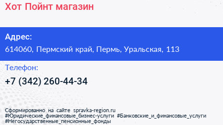 Хот Пойнт, магазин по адресу 614060, Пермский край, Пермь, Уральская, 113 в дальнейшем Организация, размещена в следующих категориях: