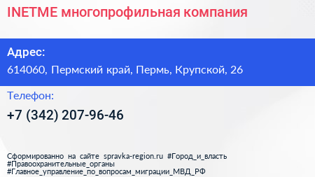 INETME, многопрофильная компания по адресу 614060, Пермский край, Пермь, Крупской, 26 в дальнейшем Организация, размещена в следующих категориях:
