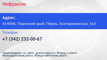 Инфраком по адресу 614068, Пермский край, Пермь, Екатерининская, 163 в дальнейшем Организация, размещена в следующих категориях: