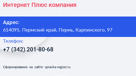 Интернет-Плюс, компания по адресу 614095, Пермский край, Пермь, Карпинского, 97 в дальнейшем Организация, размещена в следующих категориях: