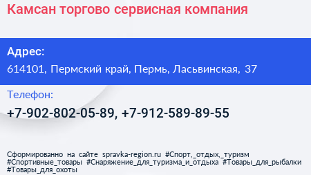 Камсан, торгово-сервисная компания по адресу 614101, Пермский край, Пермь, Ласьвинская, 37 в дальнейшем Организация, размещена в следующих категориях: