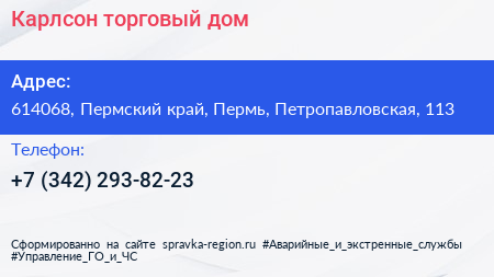 Карлсон, торговый дом по адресу 614068, Пермский край, Пермь, Петропавловская, 113 в дальнейшем Организация, размещена в следующих категориях:
