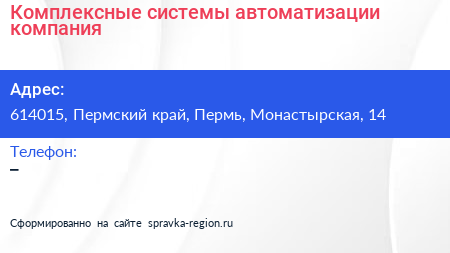 Комплексные системы автоматизации, компания по адресу 614015, Пермский край, Пермь, Монастырская, 14 в дальнейшем Организация, размещена в следующих категориях: