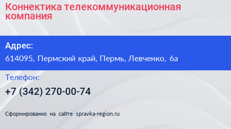 Коннектика, телекоммуникационная компания по адресу 614095, Пермский край, Пермь, Левченко, 6а в дальнейшем Организация, размещена в следующих категориях: