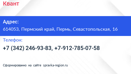 Квант по адресу 614053, Пермский край, Пермь, Севастопольская, 16 в дальнейшем Организация, размещена в следующих категориях: