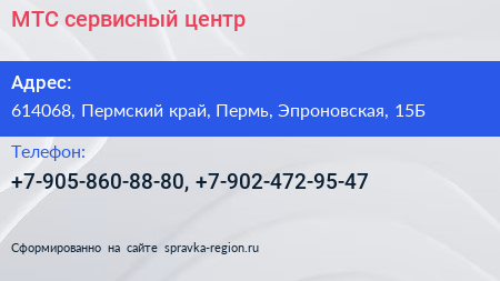 МТС, сервисный центр по адресу 614068, Пермский край, Пермь, Эпроновская, 15Б в дальнейшем Организация, размещена в следующих категориях: