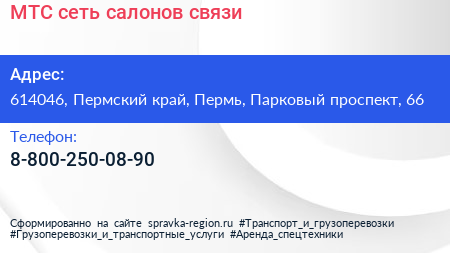 МТС, сеть салонов связи по адресу 614046, Пермский край, Пермь, Парковый проспект, 66 в дальнейшем Организация, размещена в следующих категориях: