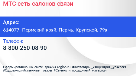 МТС, сеть салонов связи по адресу 614077, Пермский край, Пермь, Крупской, 79а в дальнейшем Организация, размещена в следующих категориях: