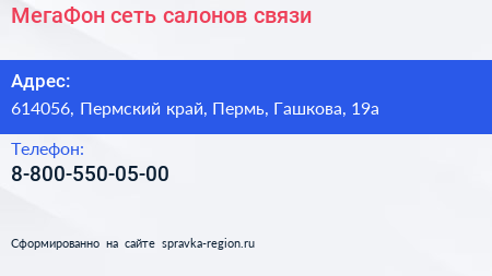 МегаФон, сеть салонов связи по адресу 614056, Пермский край, Пермь, Гашкова, 19а в дальнейшем Организация, размещена в следующих категориях: