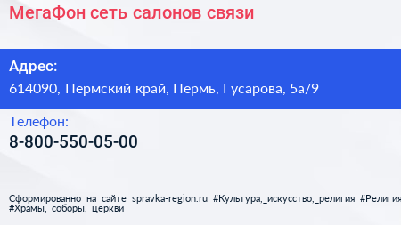 МегаФон, сеть салонов связи по адресу 614090, Пермский край, Пермь, Гусарова, 5а/9 в дальнейшем Организация, размещена в следующих категориях: