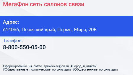 МегаФон, сеть салонов связи по адресу 614066, Пермский край, Пермь, Мира, 20Б в дальнейшем Организация, размещена в следующих категориях: