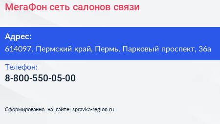 МегаФон, сеть салонов связи по адресу 614097, Пермский край, Пермь, Парковый проспект, 36а в дальнейшем Организация, размещена в следующих категориях: