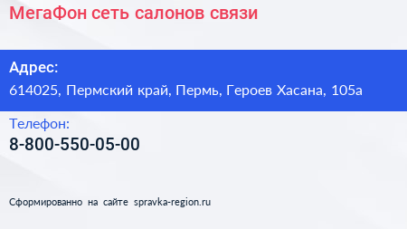 МегаФон, сеть салонов связи по адресу 614025, Пермский край, Пермь, Героев Хасана, 105а в дальнейшем Организация, размещена в следующих категориях: